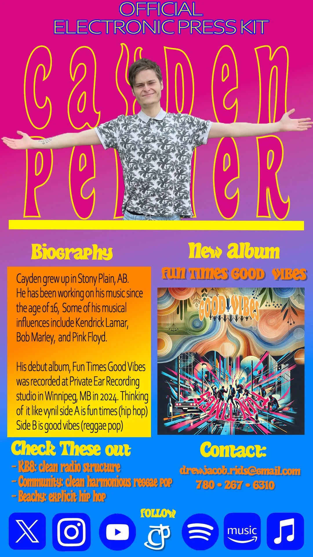 Cayden Penner’s Fun Times Good Vibes is a debut album that wears its heart on its sleeve while refusing to let the weight of the world dull its color. Released July 1st, 2025, and crafted entirely by the Alberta-born artist himself, from writing and production to composition, it’s a vibrant self-portrait painted in bold strokes of optimism, rhythm, and emotional honesty. In a world addicted to irony and detachment, Penner’s approach is refreshingly earnest. This is an album that dares to feel good without apology.